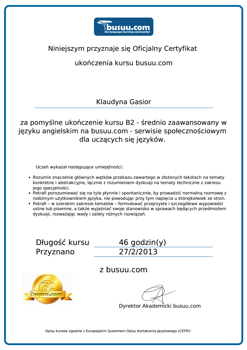 - przez tych 46 godzin przerobiłam cały kurs z języka angielskiego – od podstaw po B2, co dokumentuje udostępniony przez portal certyfikat (kliknij, aby powiększyć):