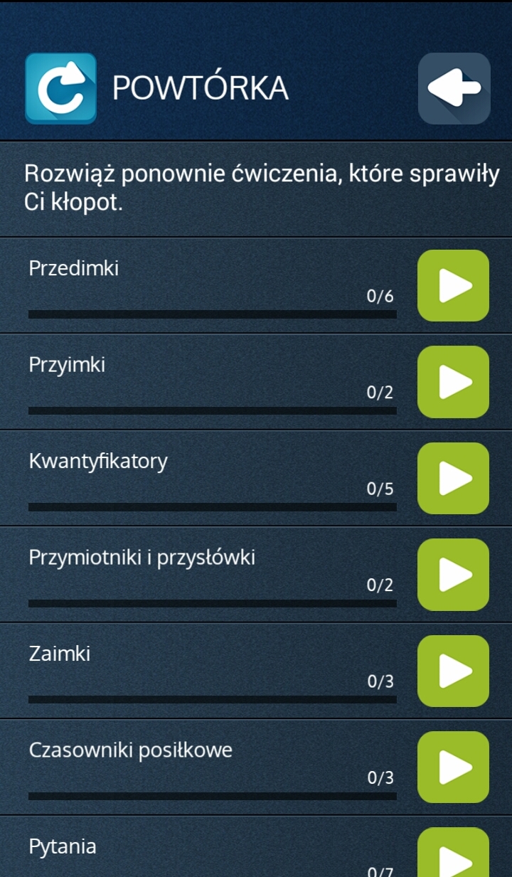 Na początek ruszamy z nauką. W każdym z działów (np. rzeczowniki, zaimki itd.) znaleźć można po 2 do 5 zestawów ćwiczeń. Jeżeli udzielimy błędnych odpowiedzi, na drugi dzień znajdziemy dane ćwiczenia w dziale powtórka. System sam wylicza, kiedy dane zagadnienie podsunąć nam kolejny raz, a kiedy trzykrotnie udzielimy poprawnej odpowiedzi, pytanie zostanie uznane za zaliczone.