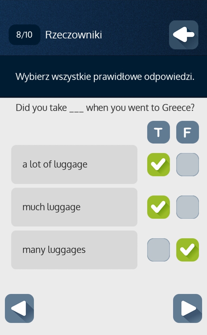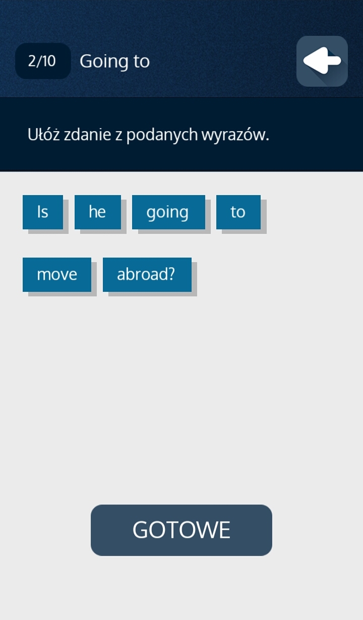 Jak widać na powyższych screenach, ćwiczenia są różnorodne i obejmują uzupełnianie zdań, układanie pytań z rozsypanych wyrazów, quizy oraz zaznaczenie czy coś jest prawdą czy fałszem.