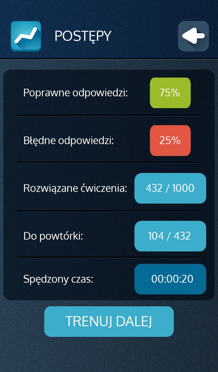Wyniki swoich dokonań można znaleźć w dziale postępy, który pokazuje procent poprawnych i błędnych odpowiedzi, liczbę rozwiązanych ćwiczeń, liczbę zagadnień do powtórzenia oraz czas spędzony w aplikacji (wcześniej wydawało mi się, że był to łączny czas, ale dziś zauważyłam, że licznik każdego dnia się zeruje).
