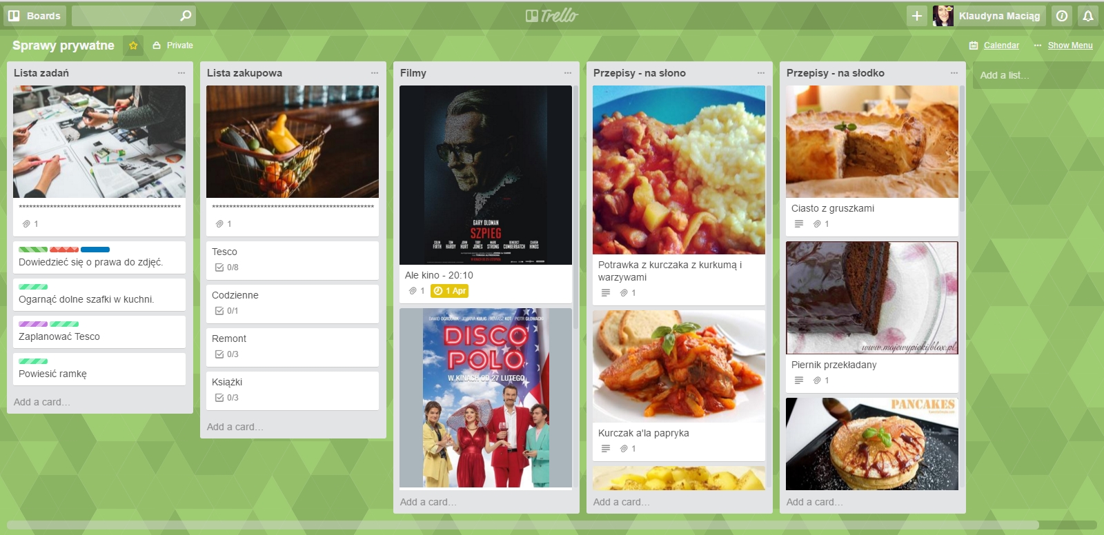 Większość moich kart na tablicach zawiera tzw. „checklisty”, czyli wygodne w obsłudze listy spraw do odhaczenia. To właśnie na nich opierają się moje listy zakupowe, codzienne zadania czy propozycje posiłków: