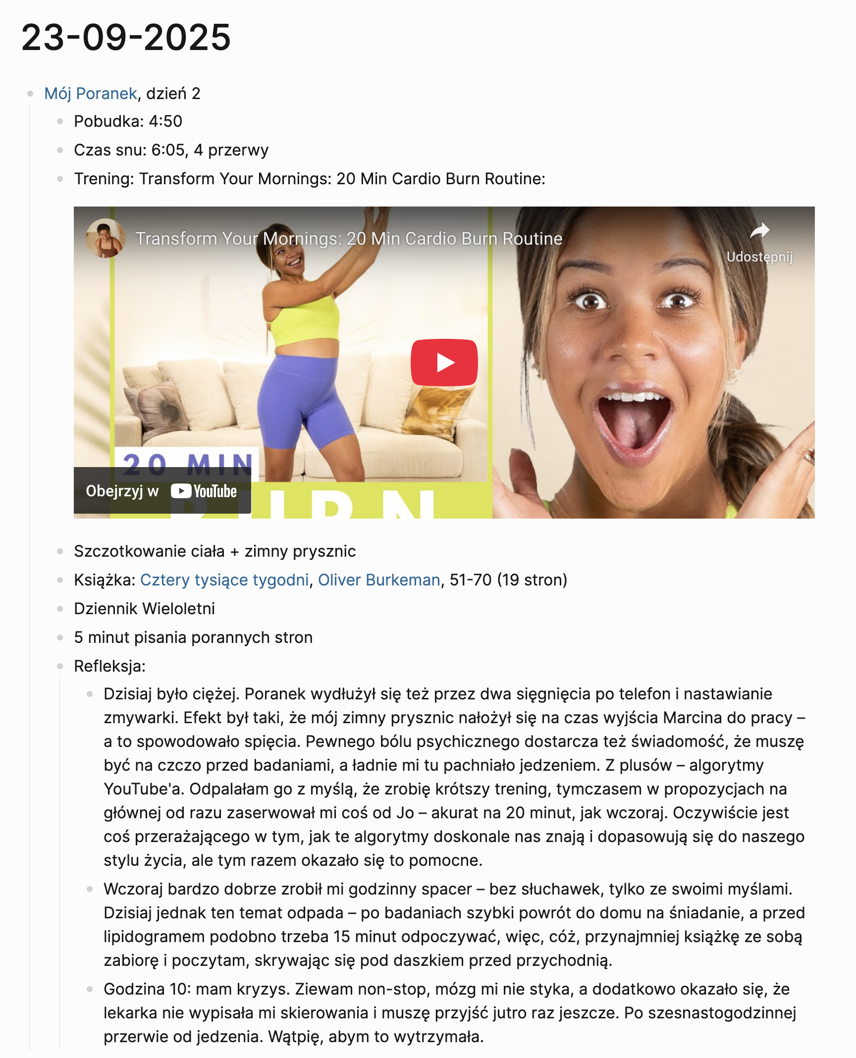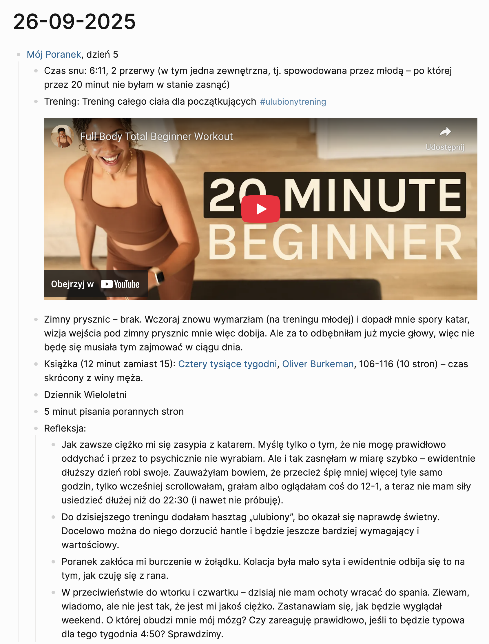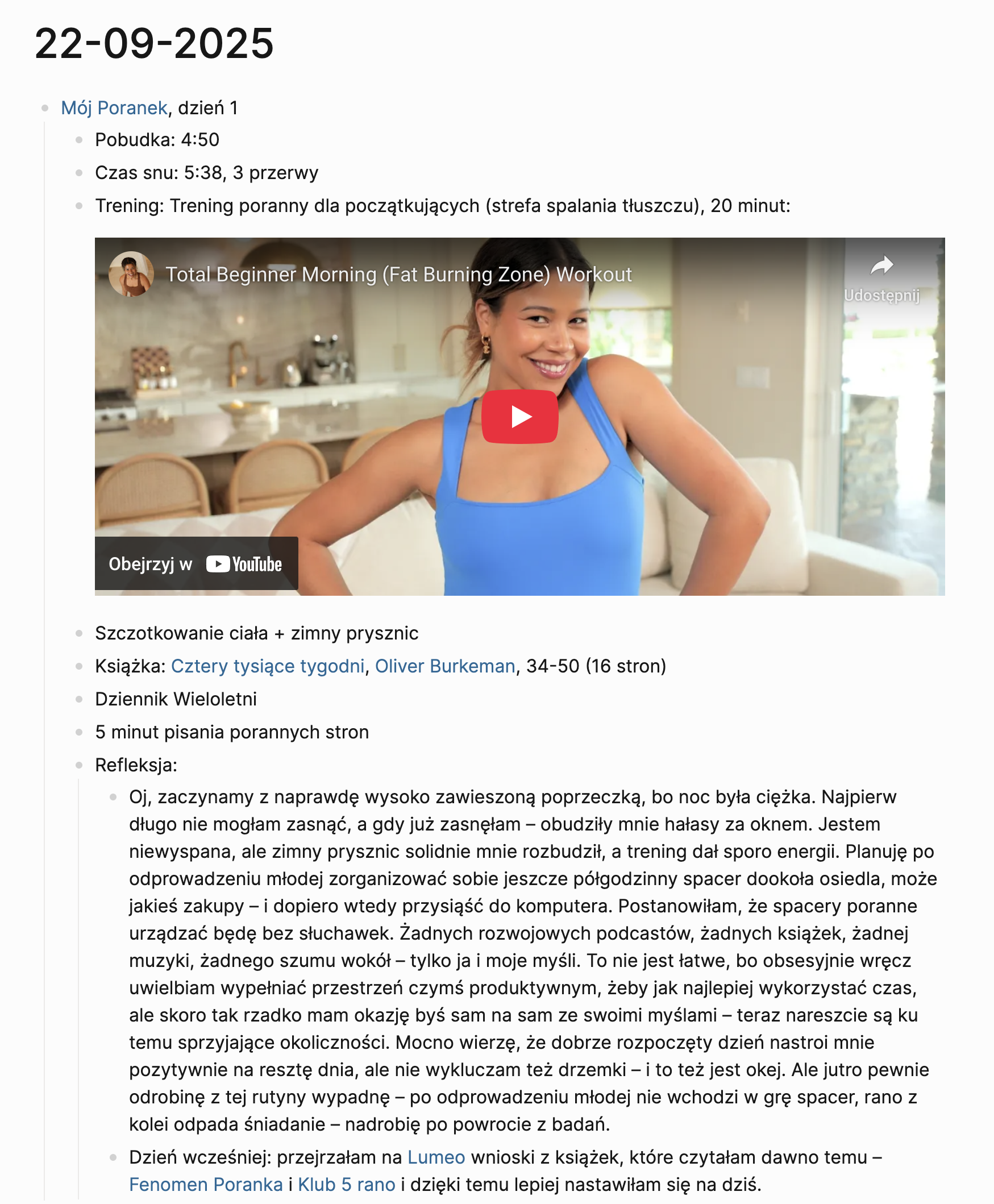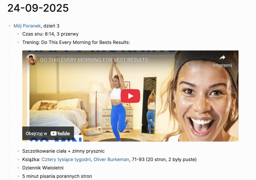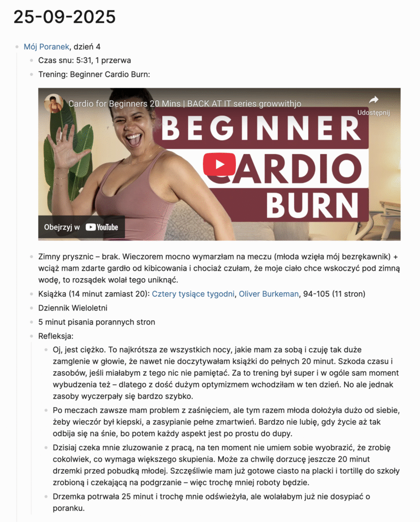 W zależności od tego, jakim tempem poruszałam się wcześniej i ile czasu zajął mi prysznic – siadam do komputera w okolicach 5:50-6:00. Pierwszy krok: odpalenie Spirit City: Lofi Sessions dla muzycznego tła. Drugi krok: uruchomienie Logseq, aplikacji, której używam do gromadzenia notatek, i dodanie wpisu do dziennika. Notuję w nim, co się działo danego poranka, ile przeczytałam, czy coś mi przeszkodziło i dzielę się krótką refleksją (niżej zamieszczę podgląd tych notatek).