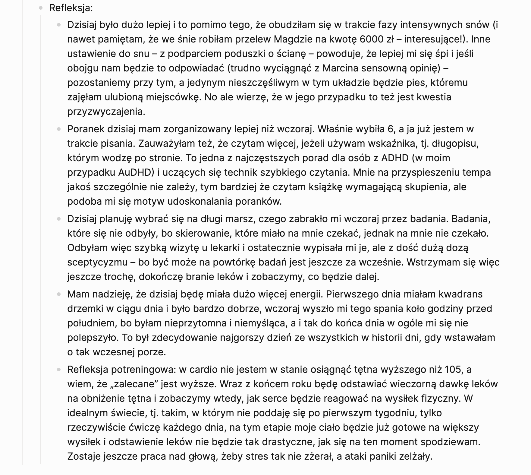 - Największym zaskoczeniem jest dla mnie to, jak łatwo przychodzi mi aktywność fizyczna. Miałam z nią w tym roku gigantyczny problem – od czasu grudniowego epizodu depresyjnego (czyli od ponad 9 miesięcy) nie znalazłam ani krztyny radości w jakiejkolwiek aktywności. To, że teraz zaczynam od niej dzień, a potem dorzucam jeszcze długie marsze – jest to dla mnie coś niebywałego. Dlatego właśnie chcę kontynuować Produktywne Poranki. Bo może jestem trochę mniej wyspana w ciągu dnia, ale za to spędzam go milion razy lepiej. No i cały czas wierzę, że gdy się do tego nowego trybu przyzwyczaję, również z zasypianiem będzie mi szło lepiej – a dzięki temu nadejdzie i wysypianie się.