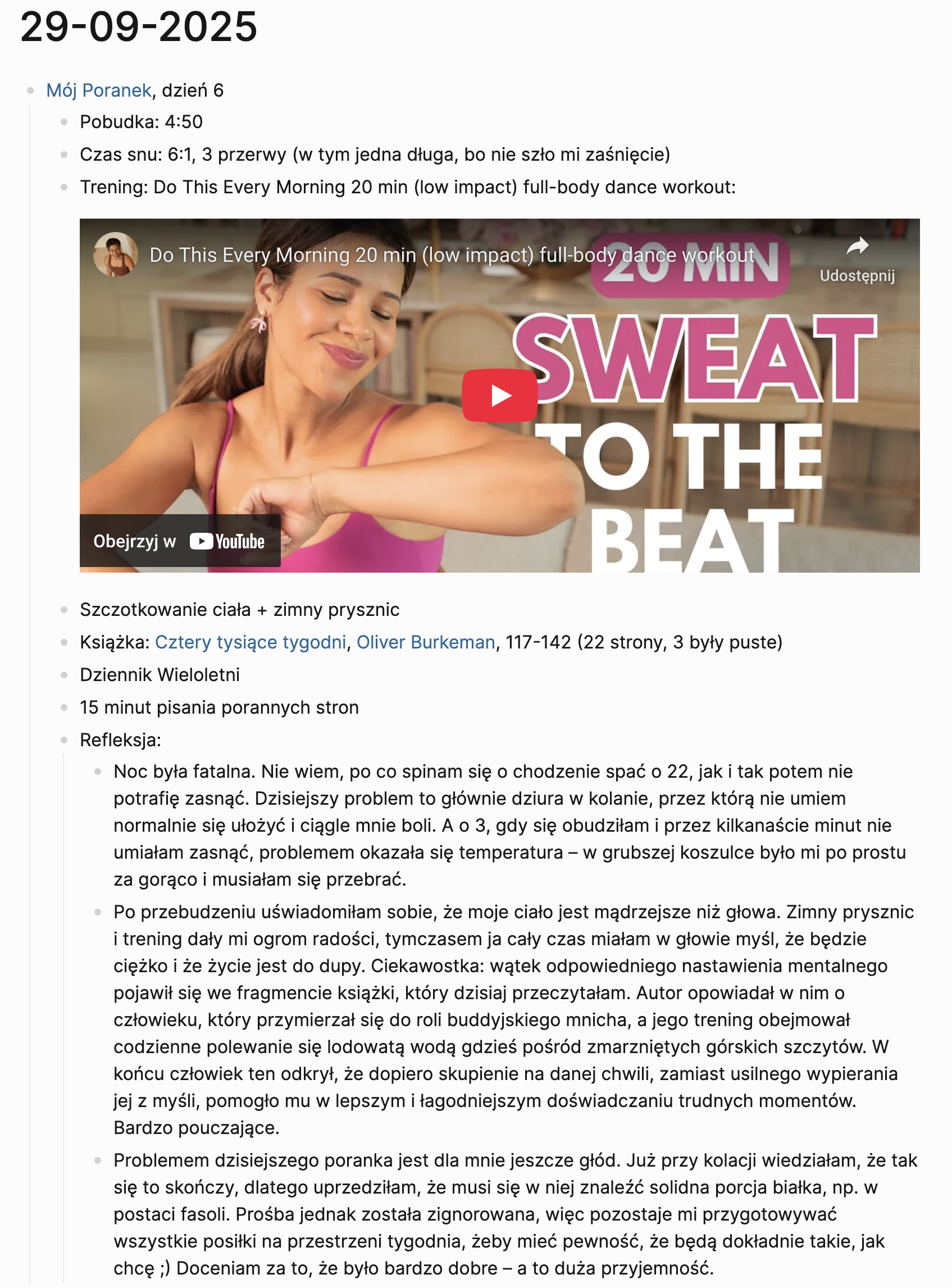 A jaki był ten drugi tydzień? Dziwaczny. Trudniejszy od pierwszego, bo miałam dużo niełatwych momentów, źle spałam i wróciły mi problemy zdrowotne wynikające z nadmiaru stresu (żołądek pozdrawia) plus objawy lekkiego przeziębienia. Ale też łatwiejszy od pierwszego, bo moje ciało przyzwyczaiło się już nie tylko do nowej godziny wstawania, ale przede wszystkim – do całej serii czynności, jakie potem wykonuję.
