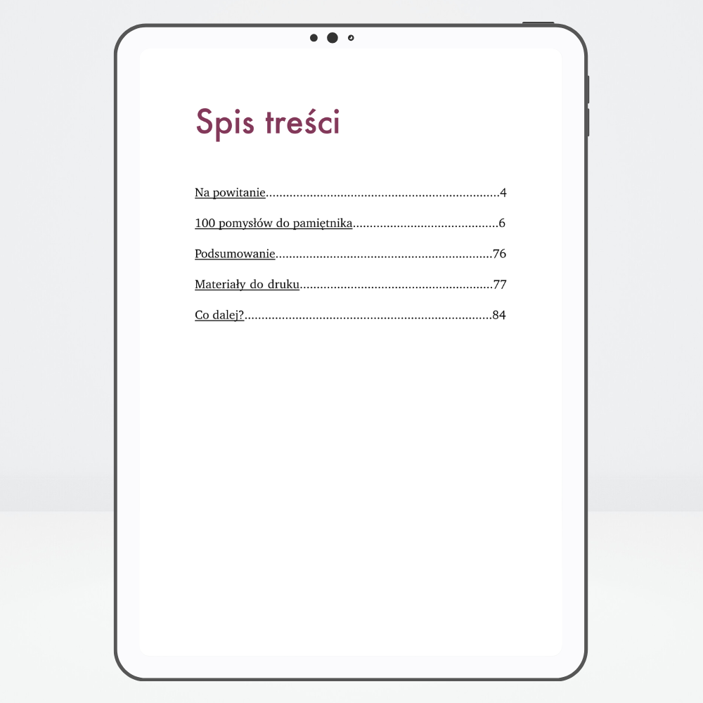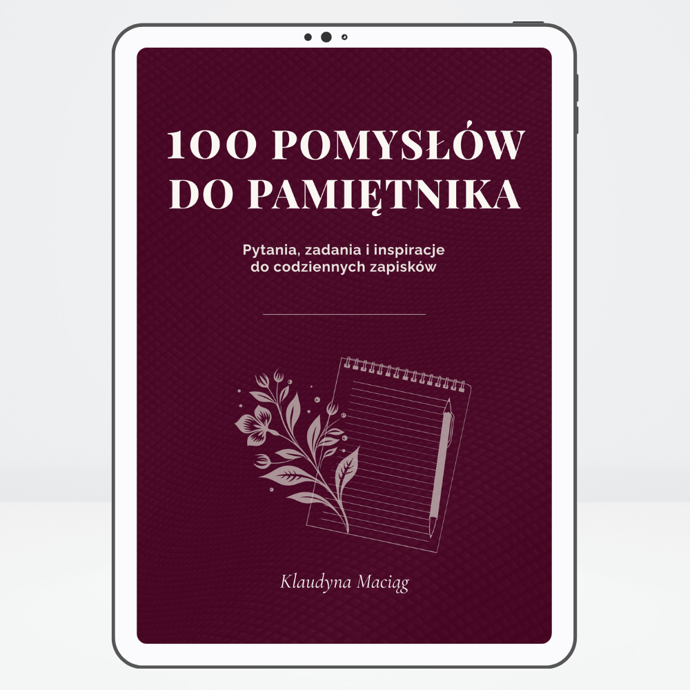 - E-book: „100 pomysłów do pamiętnika. Pytania, zadania i inspiracje do codziennych zapisków” zawierający: