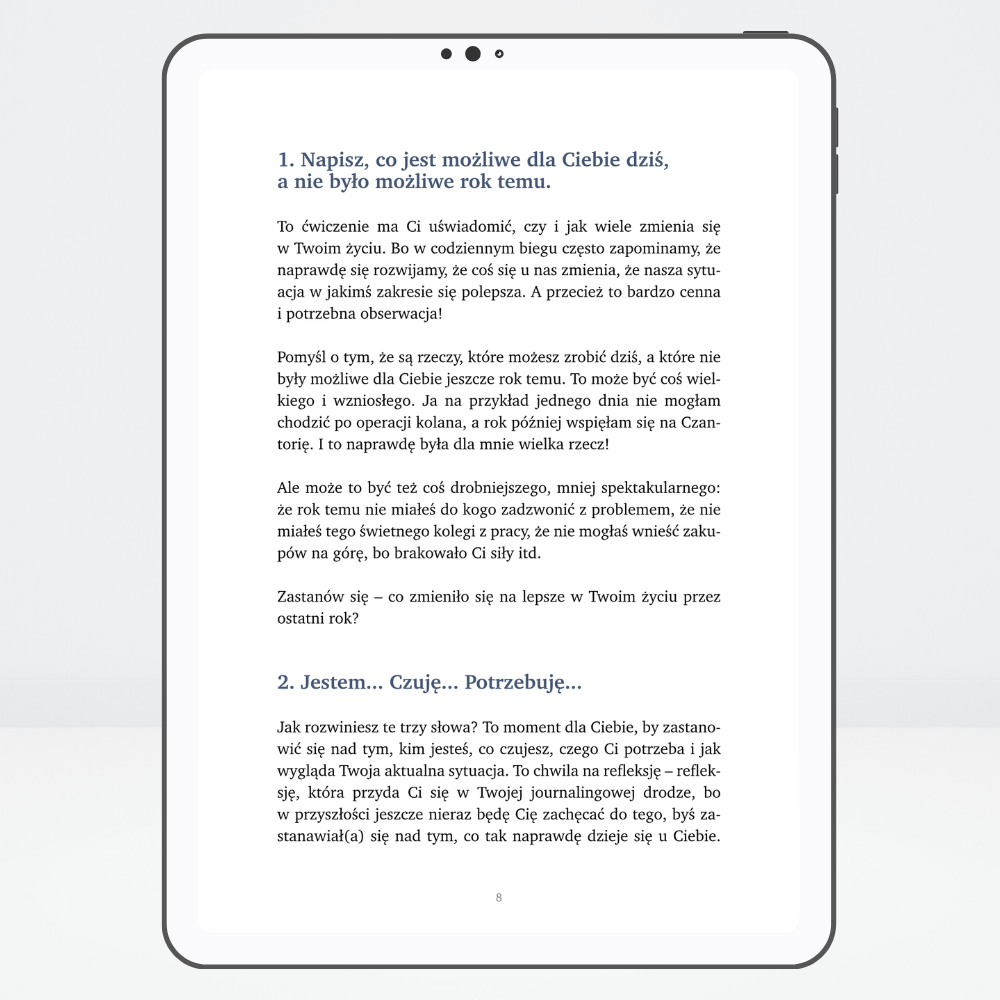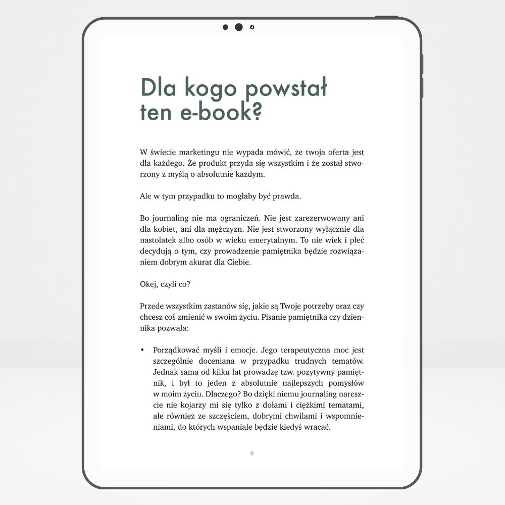 Ten e-book wspiera Cię wtedy, gdy czujesz pustkę lub chaos w głowie albo po prostu chcesz usiąść z notesem, ale nie masz pojęcia, o czym pisać. Przyda Ci się również jeżeli chcesz świadomie pracować nad swoim rozwojem z wykorzystaniem technik journalingowych.